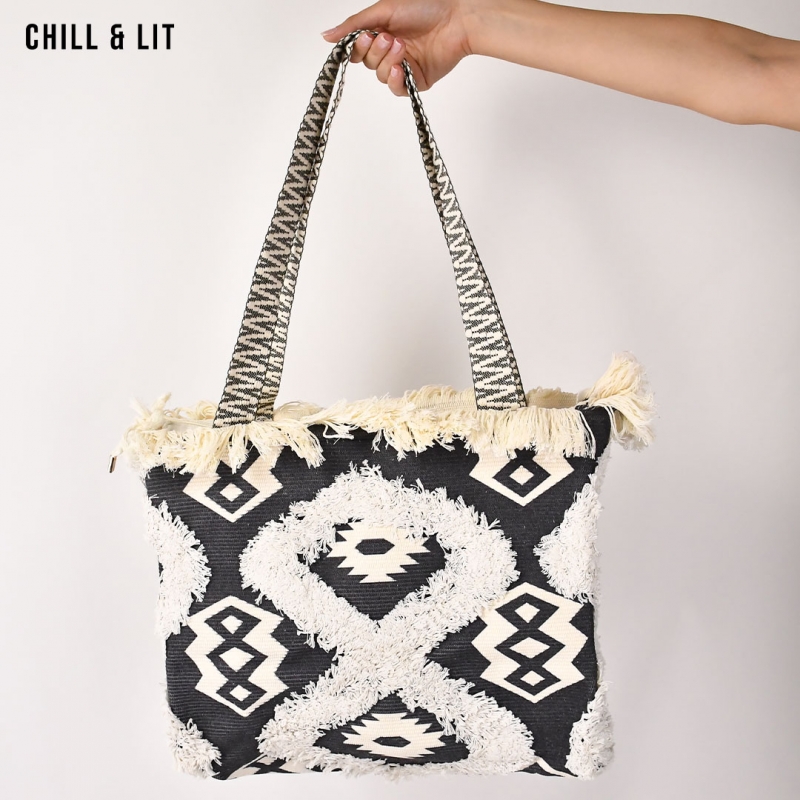 Sac cabas en tissu tressé séduit par son design bohème et ses motifs géométriques élégants. Les bords frangés lui apportent une touche de fantaisie, idéale pour un style décontracté et tendance.