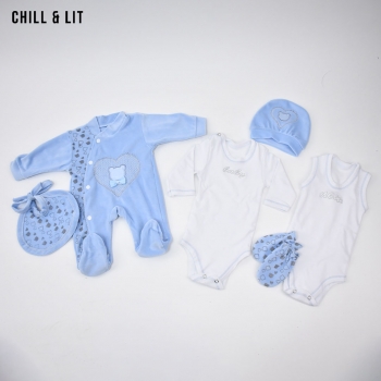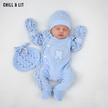 Kit Naissance Sortie Clinique 6 Pieces Body + 2 Grenouillères + Bavoir + Mouffle + Bonnet + Sans Manches 100% Coton.