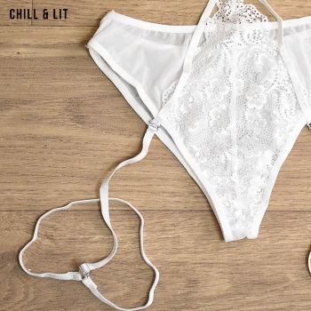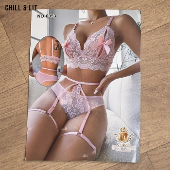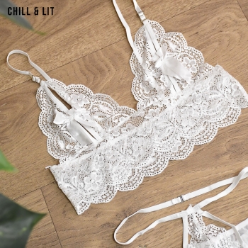 Ensemble lingerie 3 pièces élégant en dentelle blanche avec détails satinés et nœuds roses. Composé d’un soutien-gorge, d’une culotte et d’un porte-jarretelles pour un look féminin et raffiné.