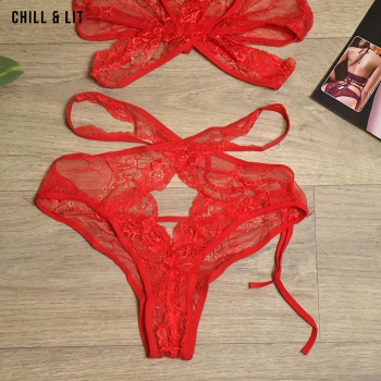 Ensemble lingerie 2 pièces en dentelle avec soutien-gorge dos nu et culotte assortie. Design croisé à l’avant et laçage au dos pour une touche glamour et sensuelle.