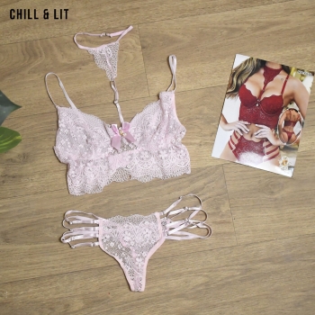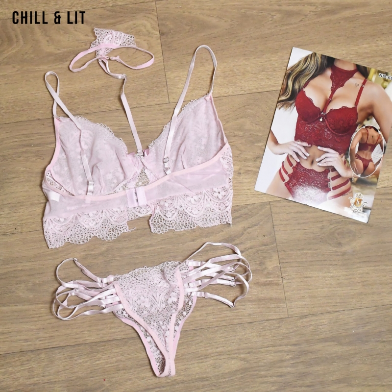 Ensemble Lingerie 2 Pièces dentelle composé d’un soutien-gorge à effet bustier avec col montant et d’une culotte haute à lanières. Élégant, sensuel et parfait pour les occasions spéciales.