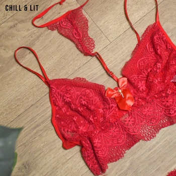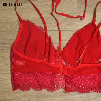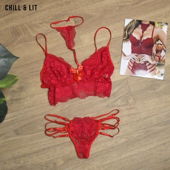 Ensemble Lingerie 2 Pièces dentelle composé d’un soutien-gorge à effet bustier avec col montant et d’une culotte haute à lanières. Élégant, sensuel et parfait pour les occasions spéciales.