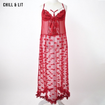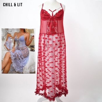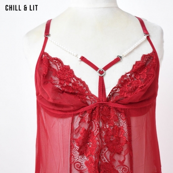 Nuisette en dentelle et tulle transparent à motifs de cœurs, ornée de fines bretelles et de détails romantiques. Douce, élégante et parfaite pour des soirées pleines de charme.