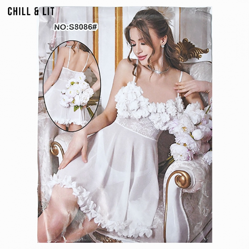 Nuisette blanche élégante en dentelle et tulle, ornée de fleurs en relief sur le buste et à l’ourlet. Bretelles fines et coupe fluide pour un look doux et romantique.