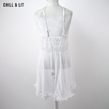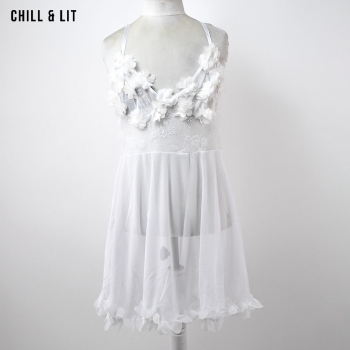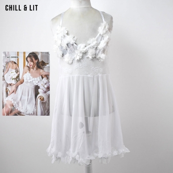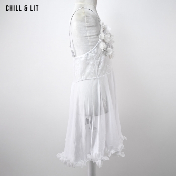 Nuisette blanche élégante en dentelle et tulle, ornée de fleurs en relief sur le buste et à l’ourlet. Bretelles fines et coupe fluide pour un look doux et romantique.