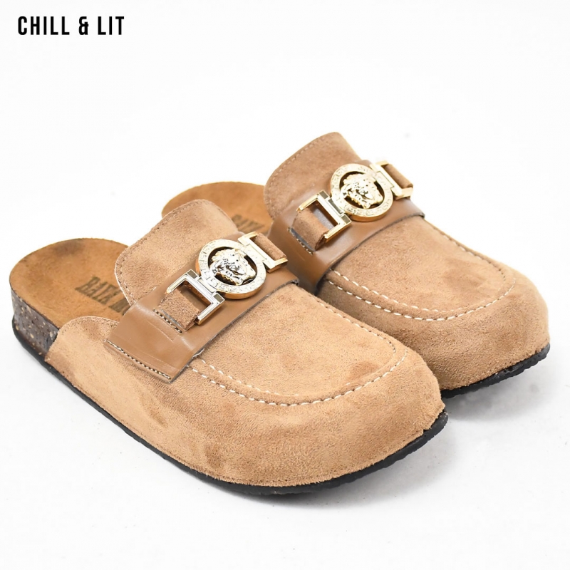 Mules Femme Daim Avec Accessoire Inoxydable, Semelles Hyper Confortables Matelassées. Hauteur de la Semelle 3cm et Pointure sur la Photo 37.