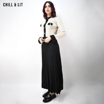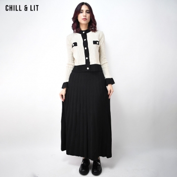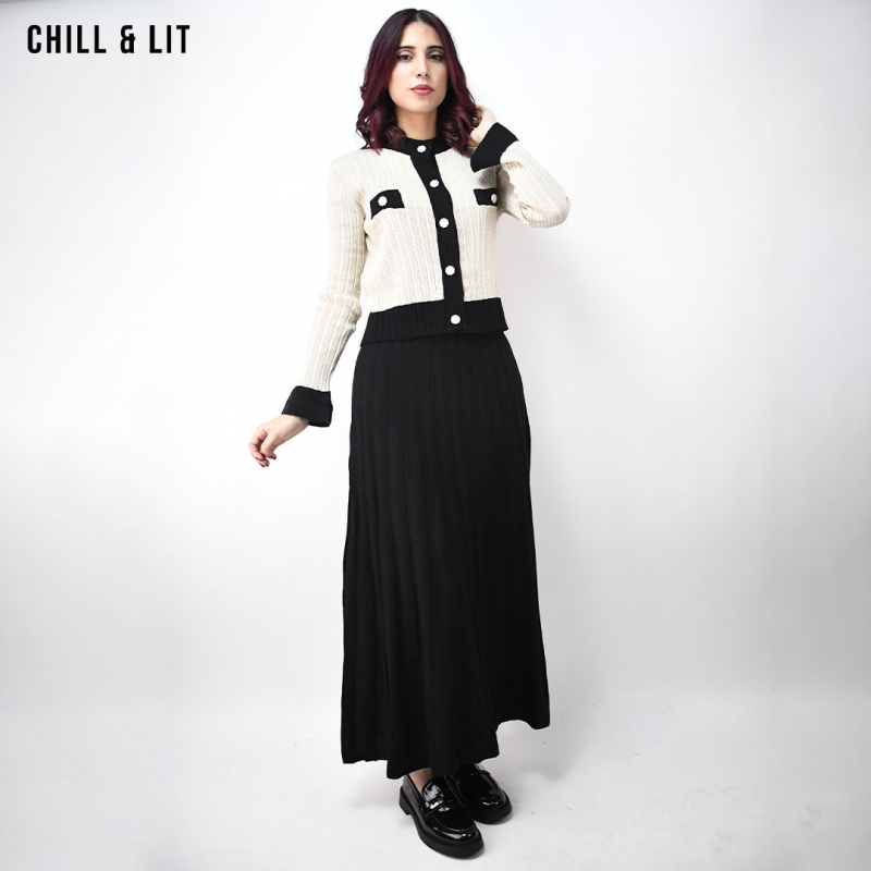 Ensemble en Laine pour Femme. Gilet Avec Fermeture en Boutons Inoxydables, Manches Longues + Jupe Large Coupe Ample . Super Tendance cet Hiver. Le Mannequin Porte La Taille Standard et Mesure 1m78.