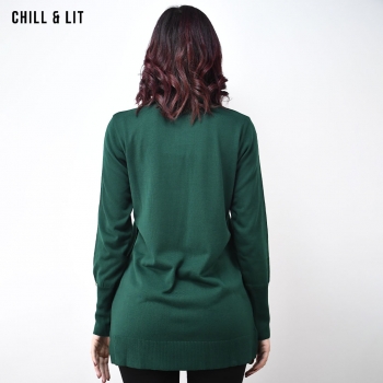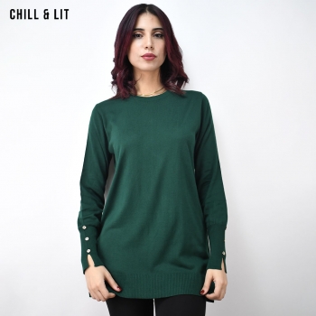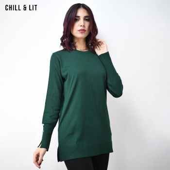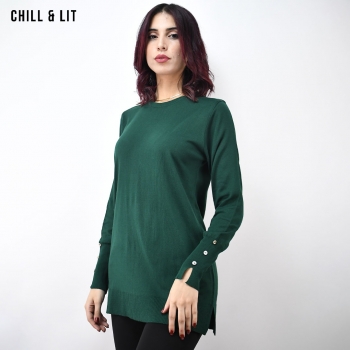 Pull Long Femme, Avec Col Rond, Manches Longues et un Détail de Boutons. Hyper Tendance. Le Mannequin Porte La Taille 2.