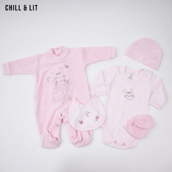 Kit Naissance Sortie Clinique 5 Pieces Body + Grenouillère + Bavoir + Mouffle + Bonnet 100% Coton.