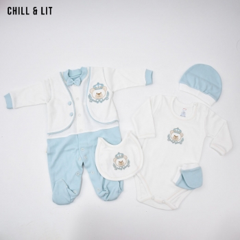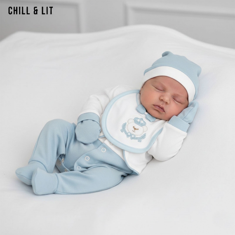 Kit Naissance Sortie Clinique 5 Pieces Body + Grenouillère + Bavoir + Moufle + Bonnet 100% Coton.