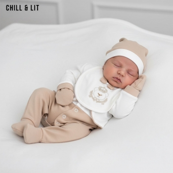 Kit Naissance Sortie Clinique 5 Pieces Body + Grenouillère + Bavoir + Moufle + Bonnet 100% Coton.