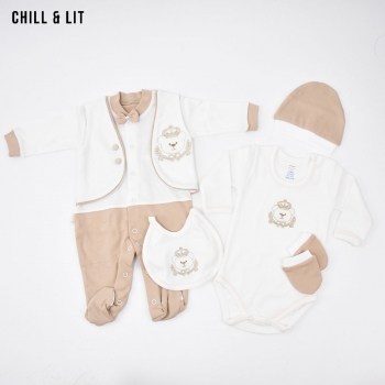 Kit Naissance Sortie Clinique 5 Pieces Body + Grenouillère + Bavoir + Moufle + Bonnet 100% Coton.