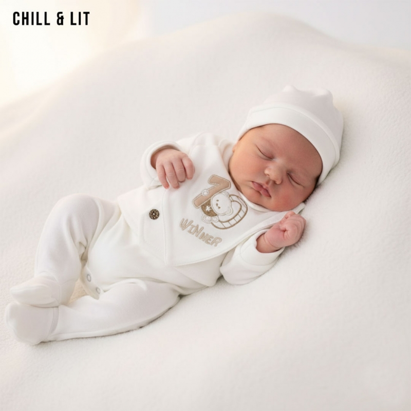 Kit Naissance Sortie Clinique 5 Pieces Body + Grenouillère + Bavoir + Moufle + Bonnet 100% Coton.