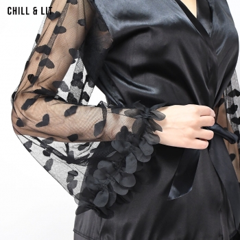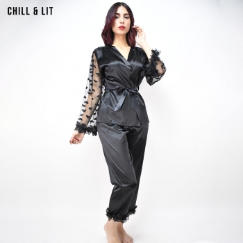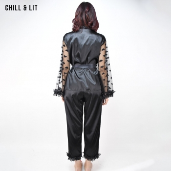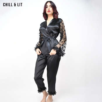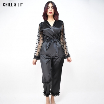 Pyjama Femme élégant en Satin doux, composé d’un haut à manches transparentes ornées de motifs et d’un pantalon fluide. Confort et raffinement pour des nuits pleines de douceur.