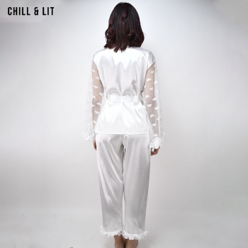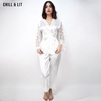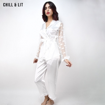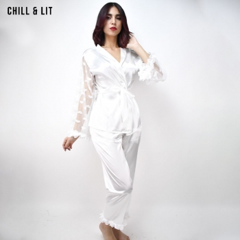 Pyjama Femme élégant en Satin doux, composé d’un haut à manches transparentes ornées de motifs et d’un pantalon fluide. Confort et raffinement pour des nuits pleines de douceur.