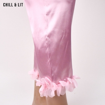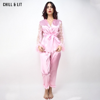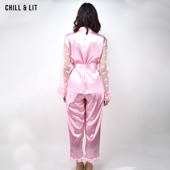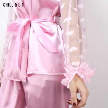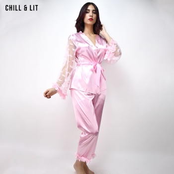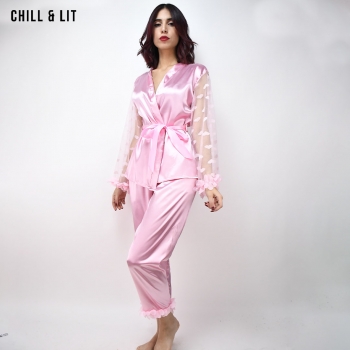 Pyjama Femme élégant en Satin doux, composé d’un haut à manches transparentes ornées de motifs et d’un pantalon fluide. Confort et raffinement pour des nuits pleines de douceur.