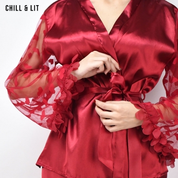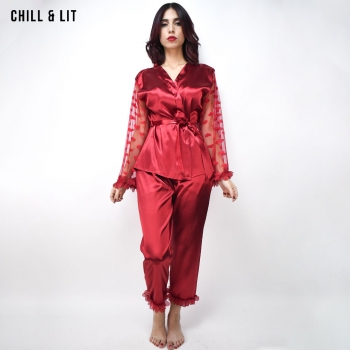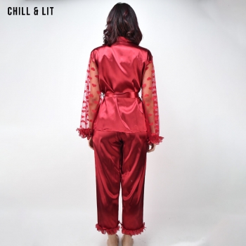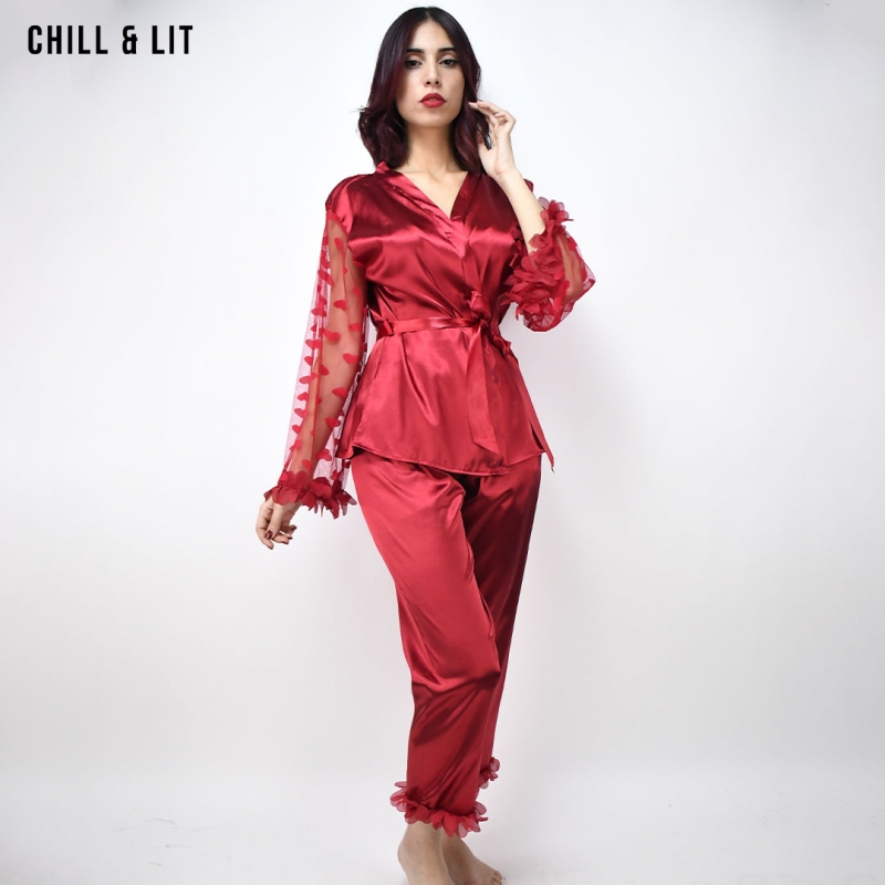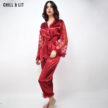 Pyjama Femme élégant en Satin doux, composé d’un haut à manches transparentes ornées de motifs et d’un pantalon fluide. Confort et raffinement pour des nuits pleines de douceur.