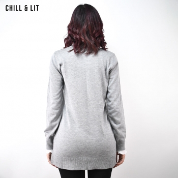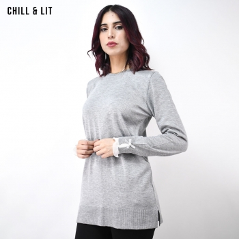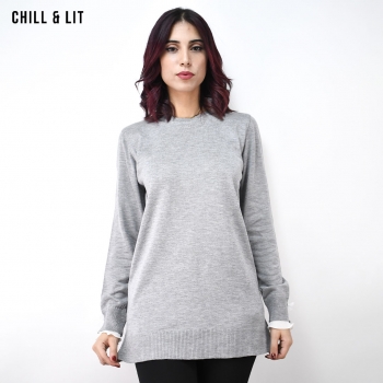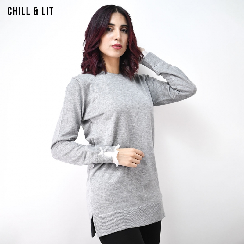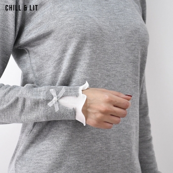 Pull Long en Laine avec Nœuds Blancs aux Poignets ,Élégant et Confortable, ce Pull basique Revisité Apporte une Touche Féminine Grâce à ses Jolis Détails Nœuds. Le Mannequin Porte La Taille 2.