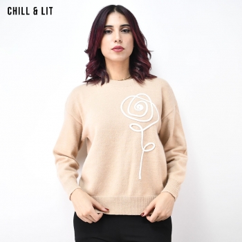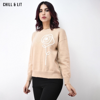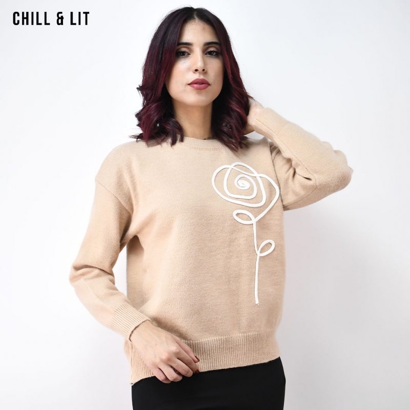 Pull Court à Broderie Bouffante Femme en Laine avec Broderie , Col Rond, Manches Longues Hyper Tendance en ce Moment. Le Mannequin Porte La Taille S/M.