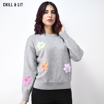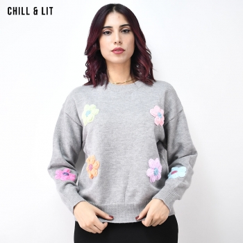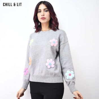 Pull Court à Broderie Bouffante Femme en Laine orné de fleurs délicates et de perles, Avec Col Rond, Manches Longues Hyper Tendance en ce Moment. Le Mannequin Porte La Taille Standard.