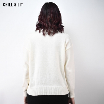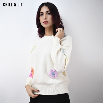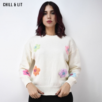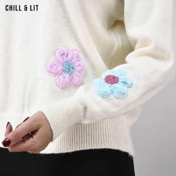 Pull Court à Broderie Bouffante Femme en Laine orné de fleurs délicates et de perles, Avec Col Rond, Manches Longues Hyper Tendance en ce Moment. Le Mannequin Porte La Taille Standard.