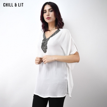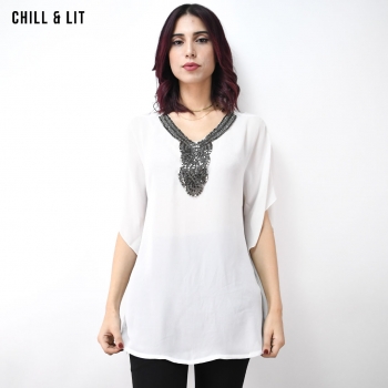 Pull Femme avec broderie est fluide allie élégance et confort. Son col en V orné de perles et de broderies apporte une touche raffinée et féminine. Le Mannequin Porte La Taille Standard.
