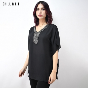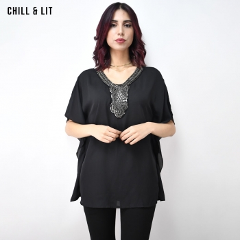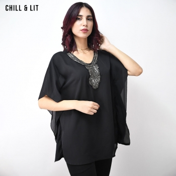 Pull Femme avec broderie est fluide allie élégance et confort. Son col en V orné de perles et de broderies apporte une touche raffinée et féminine. Le Mannequin Porte La Taille Standard.
