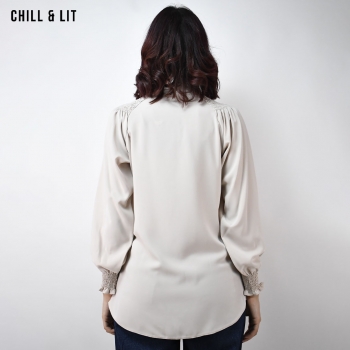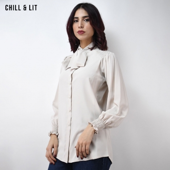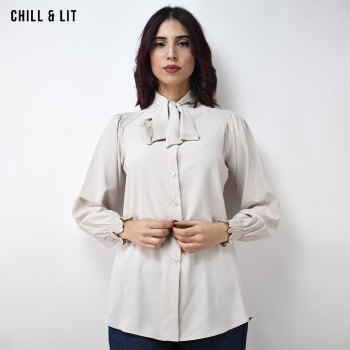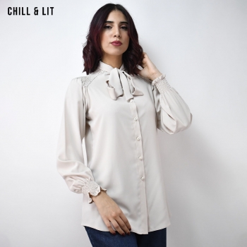 Chemise Longue pour Femme avec Col Cravate, manches élastiquées aux poignets. Très Tendance en Ce Moment. Le Mannequin Porte La Taille 38.