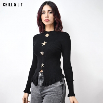Pull Court Rayé en Laine pour Femme, à Manches Longues et Col Rond. Hyper Tendance .