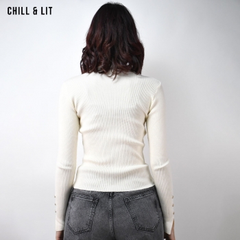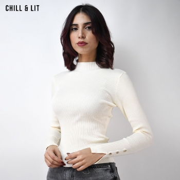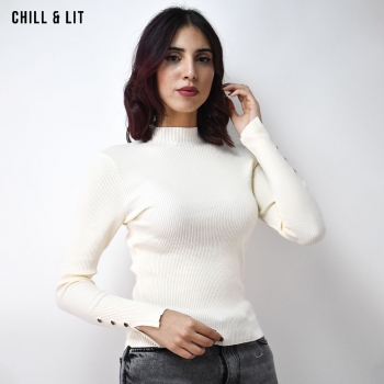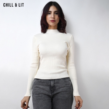 Pull en Laine Femme Manches Longues, Col Montant Hyper Tendance en ce Moment. Le Mannequin Porte La Taille Standard.