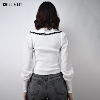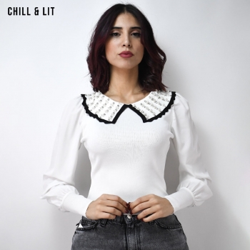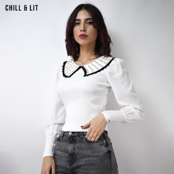 Pull Court à Manches Bouffante Femme, avec Col chemise  orné de perles. Hyper Tendance en ce Moment. Le Mannequin Porte La Taille Standard.