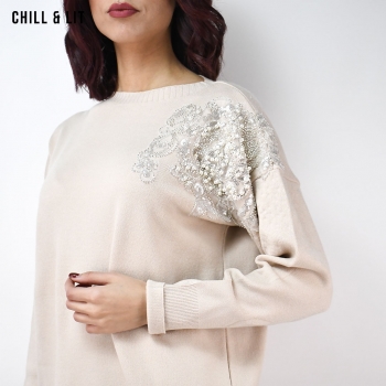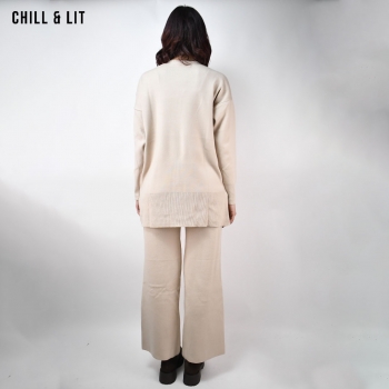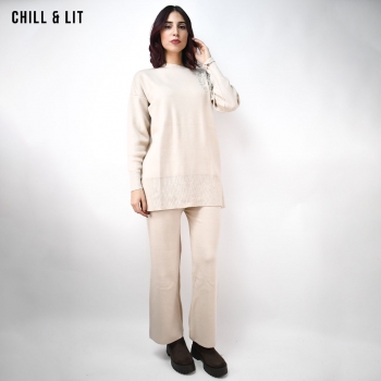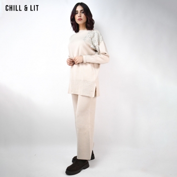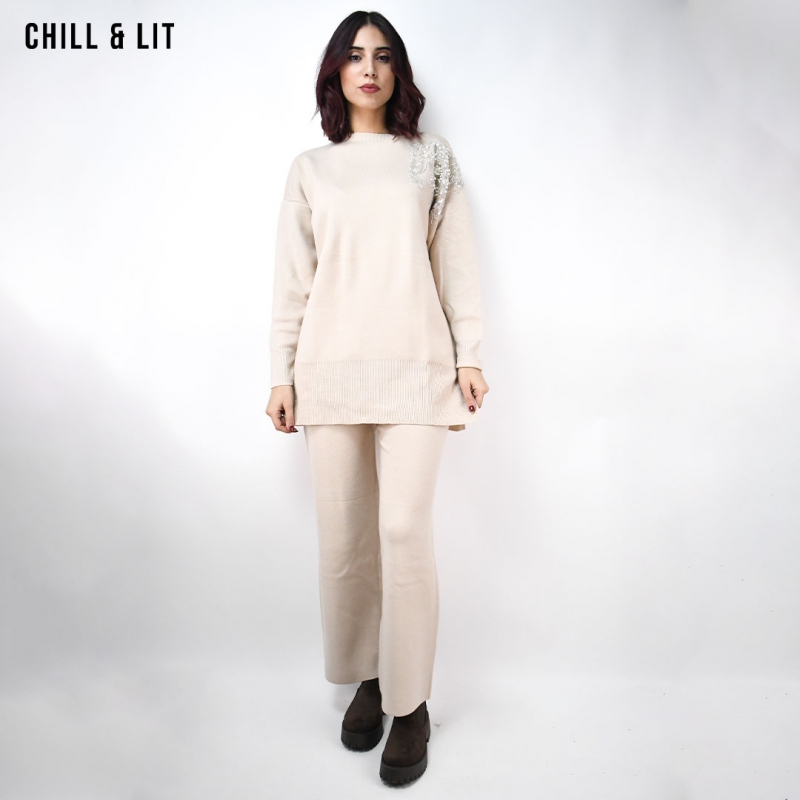 Ensemble en Laine pour Femme. Pull long à motif en strass avec Manches Longues, Col Rond et Pantalon Large Avec Taille Ajustable par Élastique Super Tendance cet Hiver. Le Mannequin Porte La Taille Standard et Mesure 1m78.