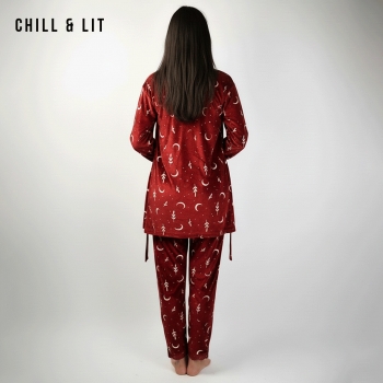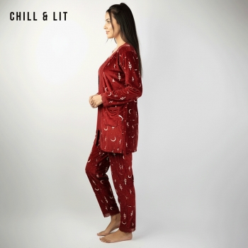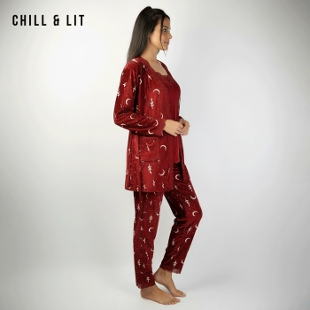 Pyjama pour Femme Confortable et Elégant, composé de 3 Pièces : d’un Haut doux, d’un Pantalon Large et d’une Chemise Assortie. Parfait pour des Nuits Confortables. Le Mannequin Porte La Taille S/M et Mesure 1m78.
