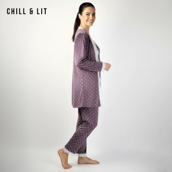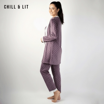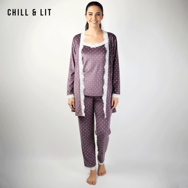 Pyjama pour Femme Confortable et Elégant, composé de 3 Pièces : d’un Haut doux, d’un Pantalon Large et d’une Chemise Assortie. Parfait pour des Nuits Confortables. Le Mannequin Porte La Taille S/M et Mesure 1m78.