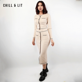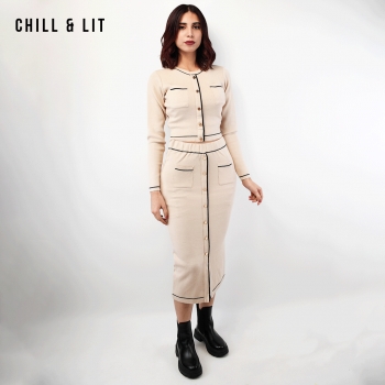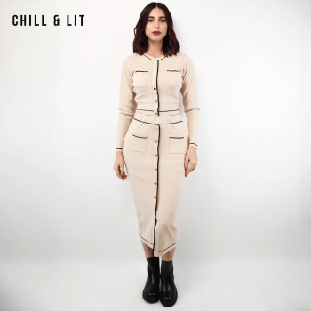 Ensemble en Laine pour Femme. Pull Avec Boutons Inoxydables, Col Rond, Manches Longues + Jupe ajustée . Super Tendance cet Hiver. Le Mannequin Porte La Taille Standard et Mesure 1m78.