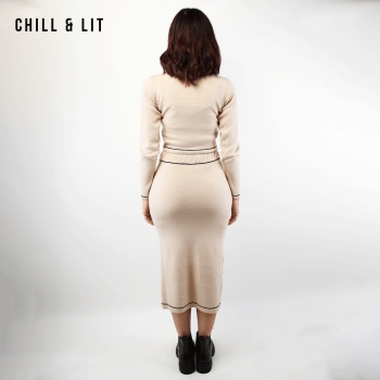Ensemble en Laine pour Femme. Pull Avec Boutons Inoxydables, Col Rond, Manches Longues + Jupe ajustée . Super Tendance cet Hiver. Le Mannequin Porte La Taille Standard et Mesure 1m78.