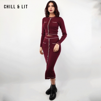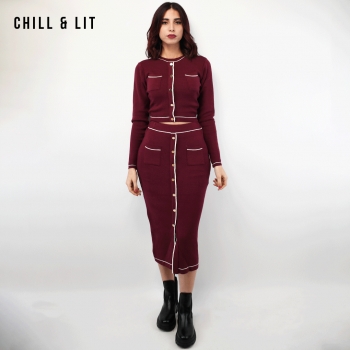 Ensemble en Laine pour Femme. Pull Avec Boutons Inoxydables, Col Rond, Manches Longues + Jupe ajustée . Super Tendance cet Hiver. Le Mannequin Porte La Taille Standard et Mesure 1m78.