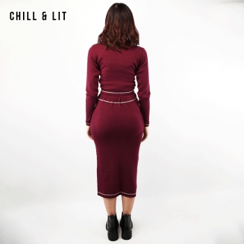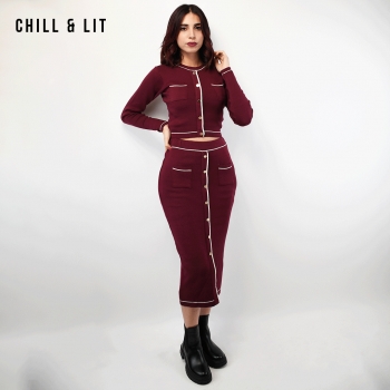 Ensemble en Laine pour Femme. Pull Avec Boutons Inoxydables, Col Rond, Manches Longues + Jupe ajustée . Super Tendance cet Hiver. Le Mannequin Porte La Taille Standard et Mesure 1m78.