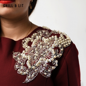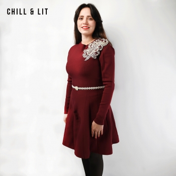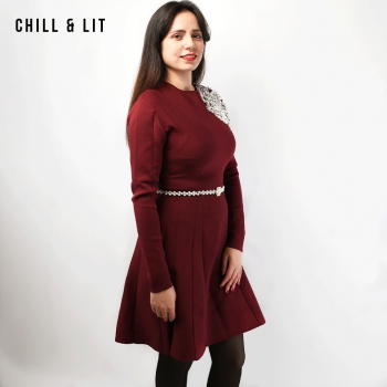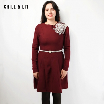 Robe de Soirée Femme mi-Longue, Manches Longues, Col Carré, avec Ceinture Ornée de Perles. Hyper Tendances cet été. Le Mannequin Porte La Taille Standard. Mesure 1.78cm.