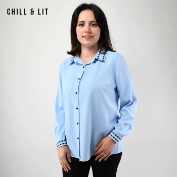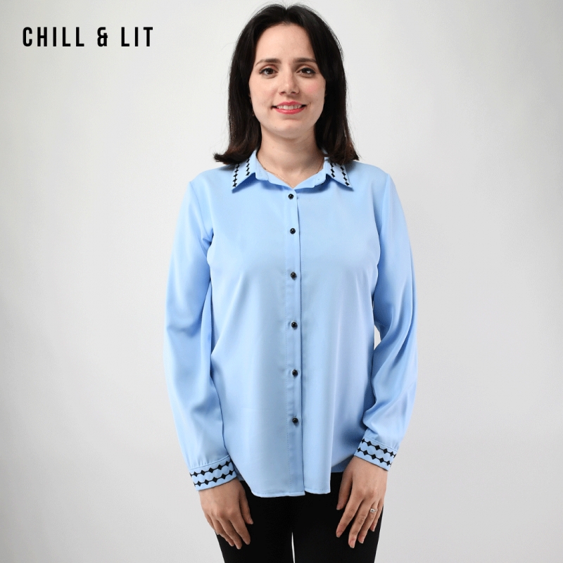 Chemise Longue pour Femme avec Manches Longues, Col Orné de Broderies. Très Tendance en Ce Moment. Le Mannequin Porte La Taille 3.