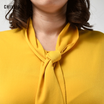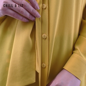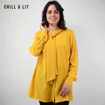 Chemise Longue pour Femme Avec Col Cravate, Manches longues. Très Tendance en Ce Moment. Le Mannequin Porte La Taille 42.