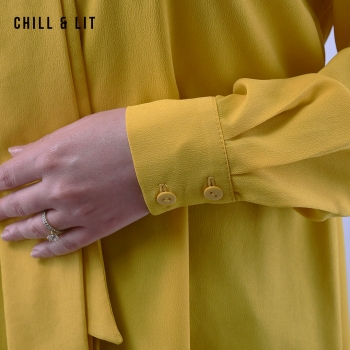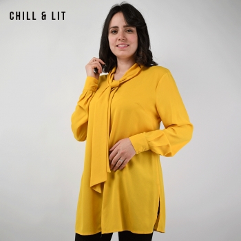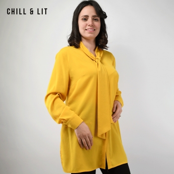 Chemise Longue pour Femme Avec Col Cravate, Manches longues. Très Tendance en Ce Moment. Le Mannequin Porte La Taille 42.