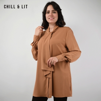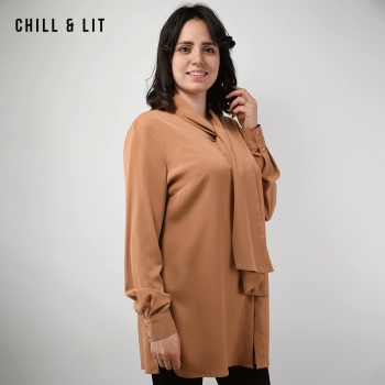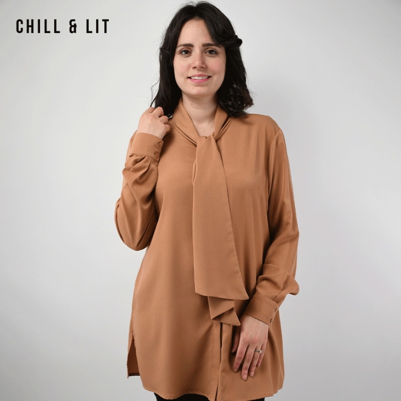 Chemise Longue pour Femme Avec Col Cravate, Manches longues. Très Tendance en Ce Moment. Le Mannequin Porte La Taille 42.