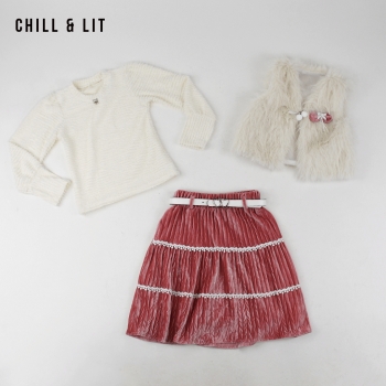 Ensemble Fillette 3 Pièces Veste sans Manches en Fourrure + Pull à Manches Longues + Jupe en Velours avec Ceinture en Ligne sur Chill&Lit. L'ensemble sur La Photo est La taille 6Ans.