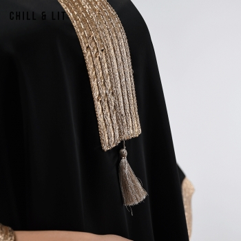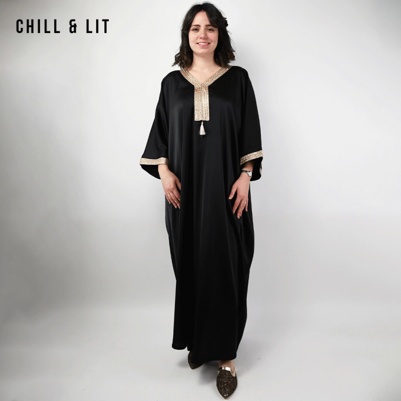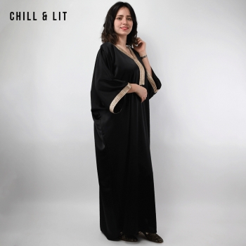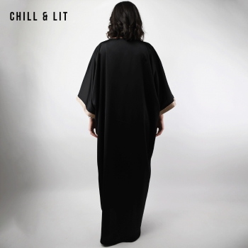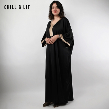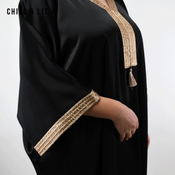 Jebba élégante à Coupe Ample et fluide, avec Manches Larges Chauve-souris et finitions Dorées au col et aux Poignets. Confort et élégance Orientale. Le mannequin porte la taille S/M et mesure 1,70Cm.