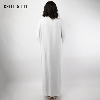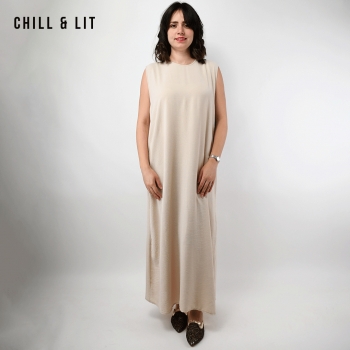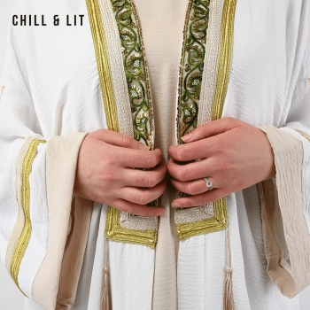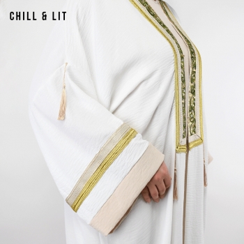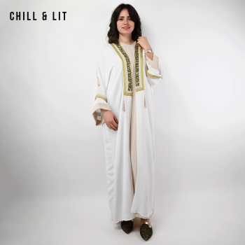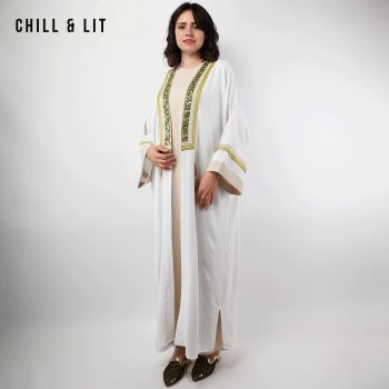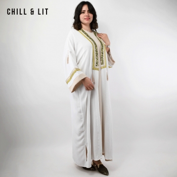 Abaya Femme Longue avec Broderies Dorées et Fente + Robe sans Manches Super Tendance en ce moment. Le mannequin porte la taille standard et mesure 1,70 m.