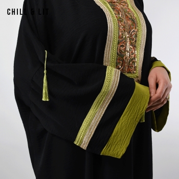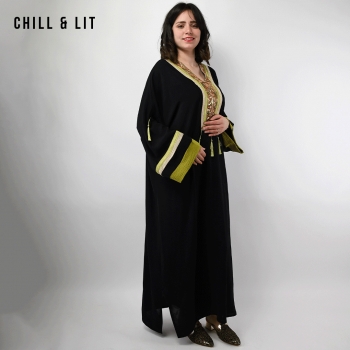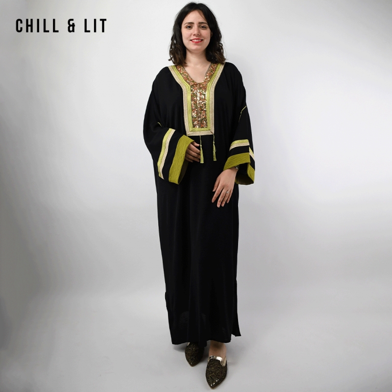 Jebba élégante à Coupe Ample et fluide, avec Manches Larges Chauve-souris et Broderies au col et aux Poignets. Confort et élégance Orientale. Le mannequin porte la taille Standard et mesure 1,70Cm.
