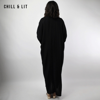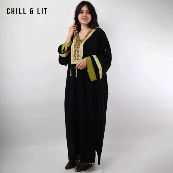 Jebba élégante à Coupe Ample et fluide, avec Manches Larges Chauve-souris et Broderies au col et aux Poignets. Confort et élégance Orientale. Le mannequin porte la taille Standard et mesure 1,70Cm.