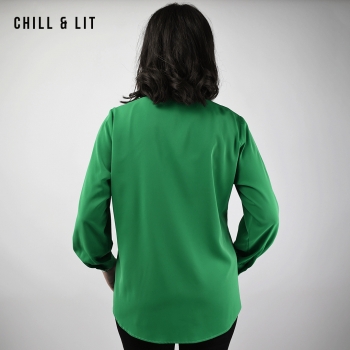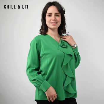 Chemise pour Femme Avec Manches longues. Broche en forme de fleur. Très Tendance en Ce Moment. Le Mannequin Porte La Taille 3. Le Mannequin Mesure 1m70.