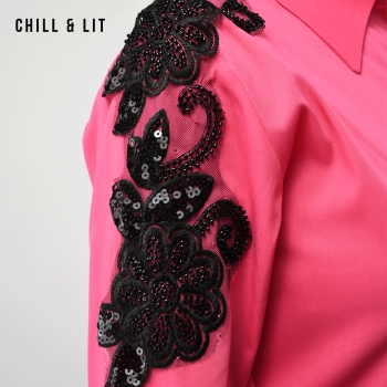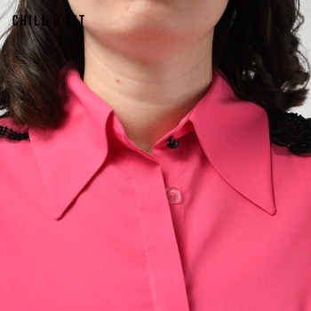 Chemise Femme Manches Longues Brodée en Sequins Très Tendance en Ce Moment. Le Mannequin Porte La Taille 3. Le Mannequin Mesure 1m78.